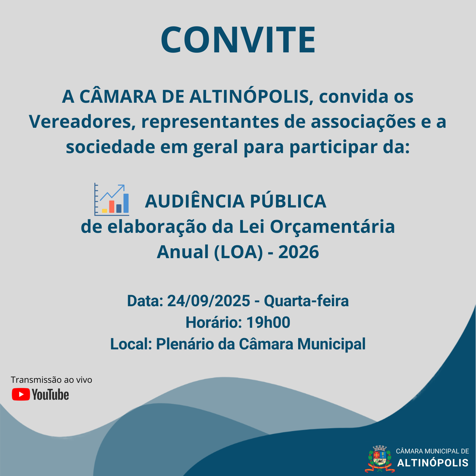 A Câmara Municipal de Altinópolis convida você, cidadão, a participar da Audiência Pública sobre a elaboração da Lei Orçamentária Anual (LOA) 2026.